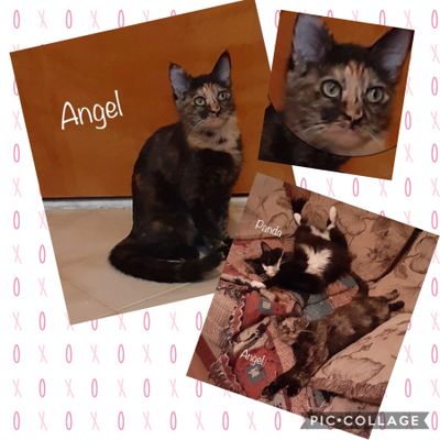 Angel who was once so shy, now enjoys frolicking with her best buddy Panda and is doing great with her new family! Less shy, she sleeps with Nancy and loves to cuddle with her adopted siblings, Panda, Red and Baby!